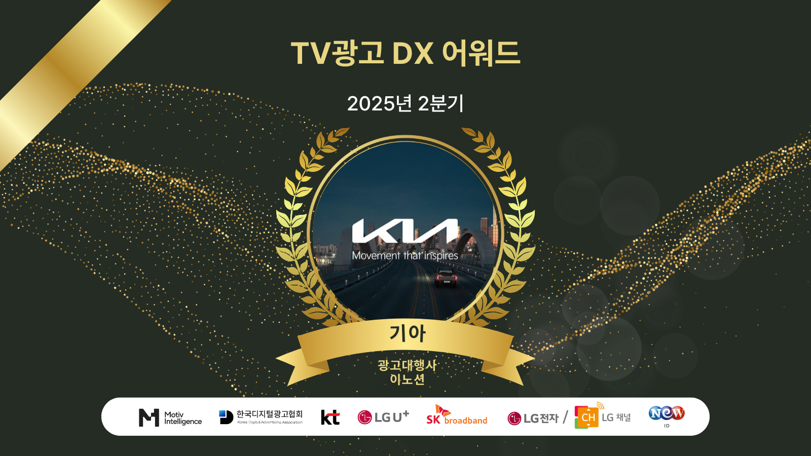 TV광고의 디지털 전환을 촉진하고 우수 사례를 발굴하기 위해 모티브인텔리전스, KT, LG유플러스, SK브로드밴드, LG전자(LG채널), 뉴 아이디, 한국디지털광고협회가 함께 주최하는 TV광고 DX 어워드! 2025년 2분기 수상작으로 기아의 ‘타스만 런칭 캠페인’이 선정되었습니다!