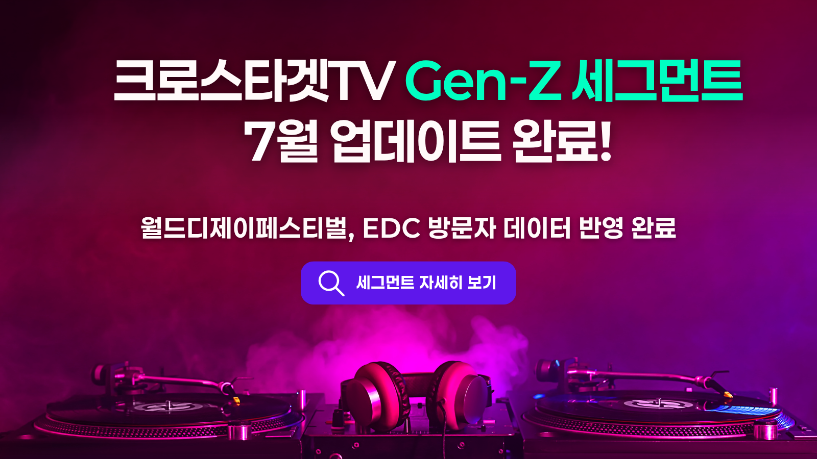 6년 만에 돌아온 글로벌 EDM 페스티벌인 EDC(일렉트릭 데이지 카니발)와 라스베가스 SPHERE(스피어) 공연으로 센세이션을 일으킨 글로벌 디제이 Anyma(애니마) 초청으로 화제가 되었던 월드디제이페스티벌 실제 방문자 데이터가 크로스타겟TV Gen-Z 세그먼트에 새롭게 추가되었습니다.